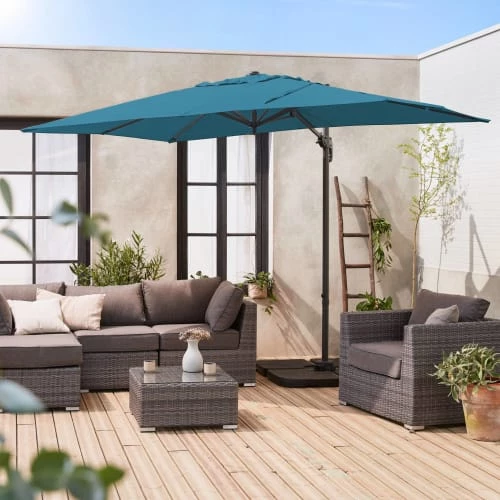 De forme rectangulaire, le parasol Antibes est très moderne. Pratique, il se manipule aisément grâce à la manivelle anti-retour, à la poignée d’inclinaison et à la pédale de rotation dont il est doté. En plus, il s’adapte à vos besoins car il est inclinable et rabattable, une fois ouvert. Bien pensé, Antibes est muni d’un auvent sur le sommet qui favorise la circulation de l’air et évite que le parasol ne prenne le vent en cas de petite brise. Son pied en forme de croix doit être fixé dans un sol dur ou lesté avec des dalles dédiées.