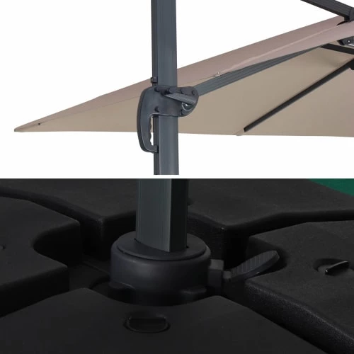 Attention, les dalles nécessaires pour lester le parasol ne sont pas fournies, vous retrouverez une sélection de dalles dans notre boutique (remplissable ou en résine).Vous pourrez également trouver des lests spéciaux en béton (de 40x40cm à 50x50cm), dans les grandes surfaces de bricolage.