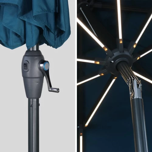 Avec un mât droit et une toile de forme octogonale, le parasol Hélios est élégant et indémodable. Il se manipule facilement grâce à sa manivelle anti retour. Très pratique, il peut éclairer vos soirées grâce au système d’éclairage à LED dont il est doté. Ce système est bien intégré au parasol. Le circuit est camouflé, l’interrupteur est placé sur le module de la manivelle qui comporte également un compartiment pour loger les piles (fournies).Le panneau solaire placé en haut du parasol permet de recharger les piles. L’auvent sur le sommet permet à l’air de bien circuler et évite que le parasol prenne le vent.
