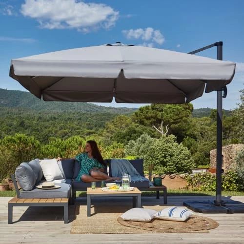 Il peut être tourné à 360 degrés pour choisir l’orientation la plus pratique et possède une manivelle qui permet d’ouvrir et de fermer le parasol très simplement.