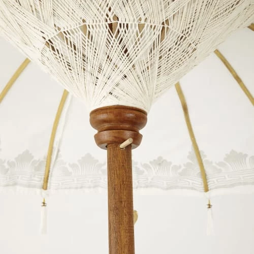 Poussez les portes d’un jardin luxuriant empreint de sérénité avec l’ombrelle en coton écru motifs dorés UBUD. Craquez pour sa toile en coton écru aux motifs dorés agrémentée de pampilles en métal et de pompons. Son pied avec des parties sculptées dorées rajoutera une touche exotique chic à l’ensemble. Complétez cette ambiance bohème en associant cette ombrelle à des coussins de sol et des matelas gaddiposh.