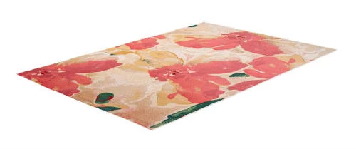 Les fleurs roses et le fond clair du tapis créent une légère atmosphère printanière qui invite à la détente et à la rêverie, tant à l’intérieur qu’à l’extérieur de la maison.